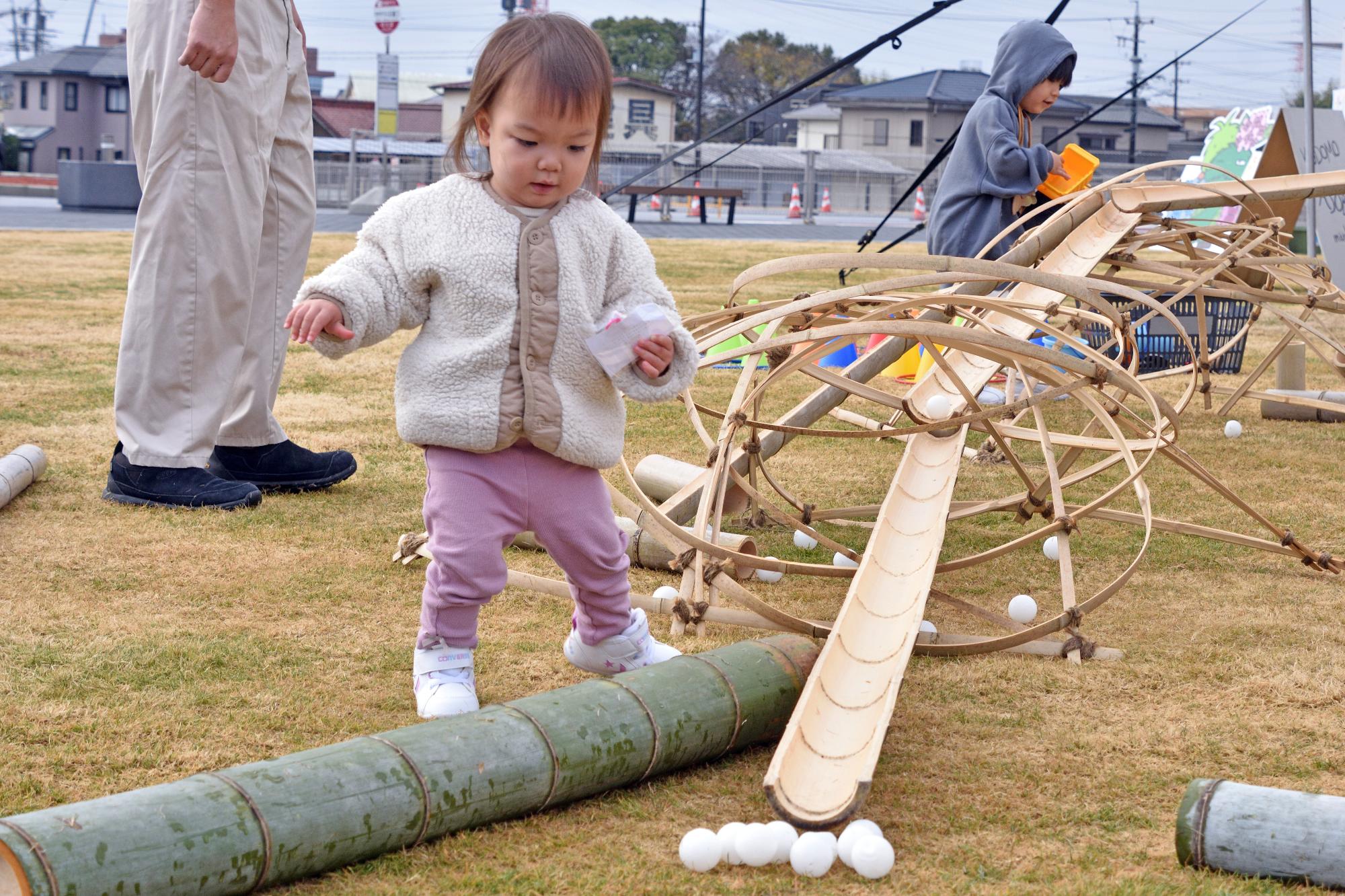 〈市民スタッフ 伊藤茂年〉"やってみたい"に出会える体験がいっぱい!「こどもと遊べる!こどあそマーケット」が12月20日、道の駅マチテラス日進の芝生広場にやってきました。降っていた雨も上がり、たくさんこどもたちが集まってきました。