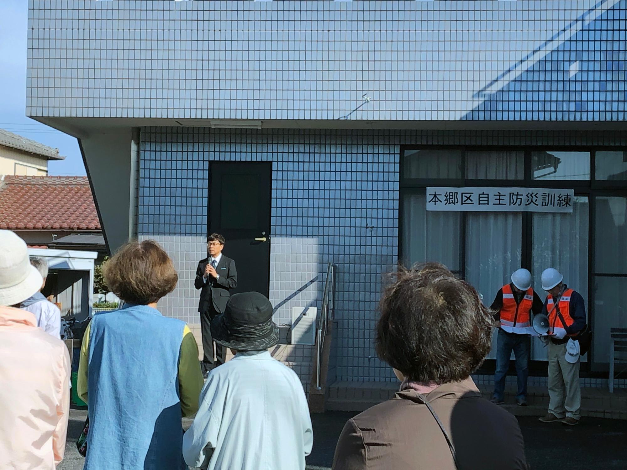 本郷区自主防災会主催の防災訓練が実施されました。区民の皆様が本郷公民館までの避難訓練や消火訓練、煙体験などを行っていただき、防災力の向上が図られました。