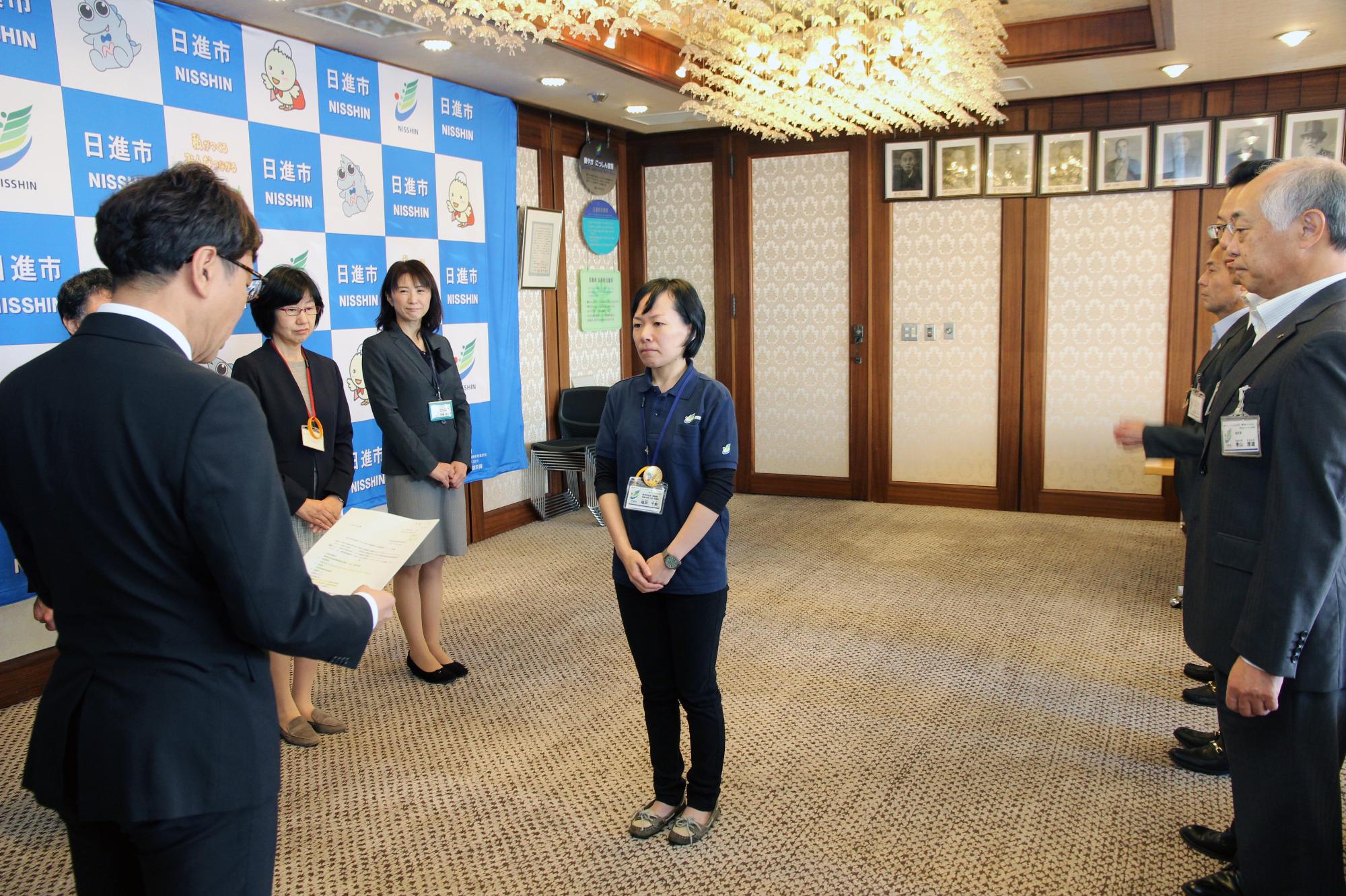 台風19号の影響により被害を受けた長野県長野市で災害対応にあたる本市職員1名の出発式を行いました。業務にあたる職員は、健康課の保健師、福岡千勢さんで、避難住民の健康支援・健康管理業務を行います。期間は10月30日から11月5日までです。